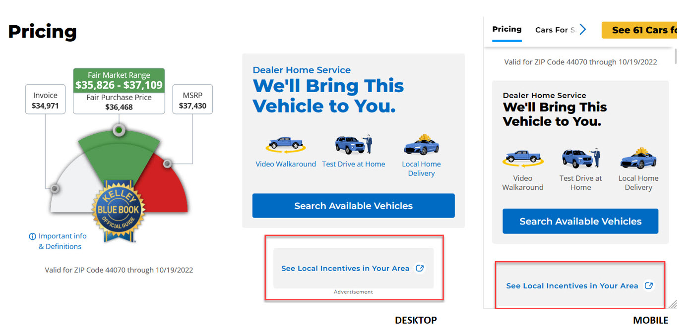 The regional text link allows internal and external click-outs and it is also positioned adjacent to the price advisor.