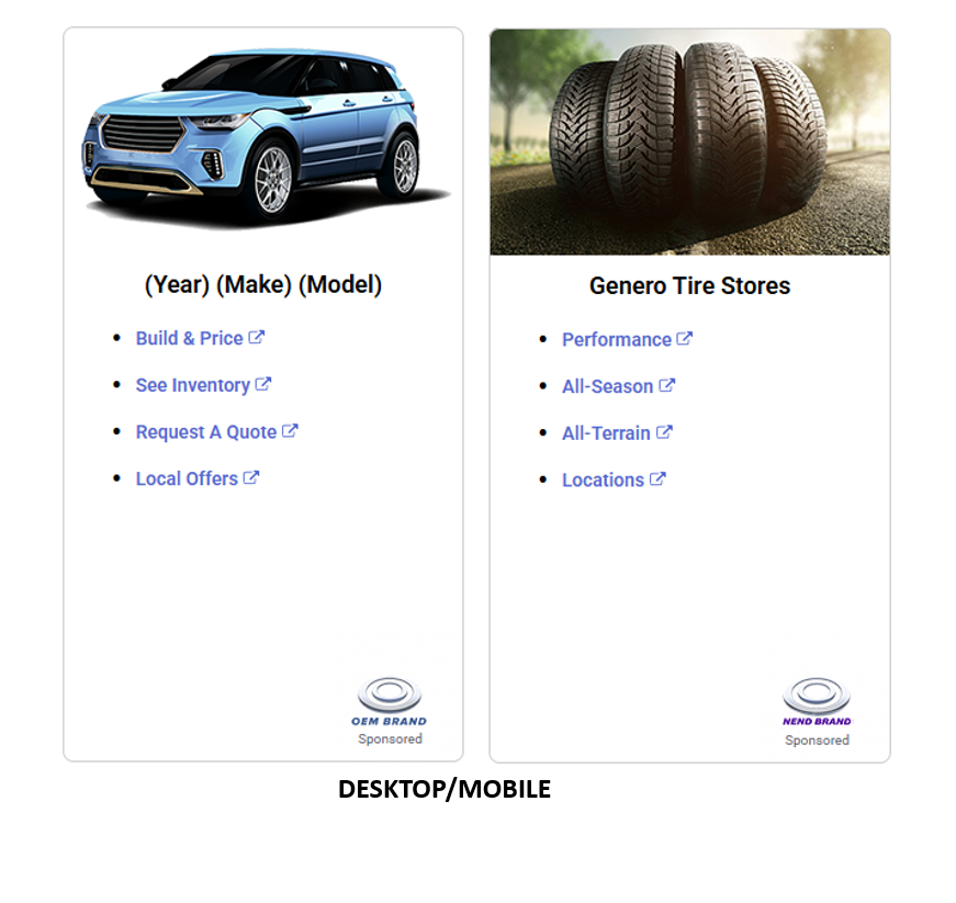 - Multiple click tags: Vehicle image, logo and one for each Call-To-Action (CTA). All redirect to OEM or advertiser site
