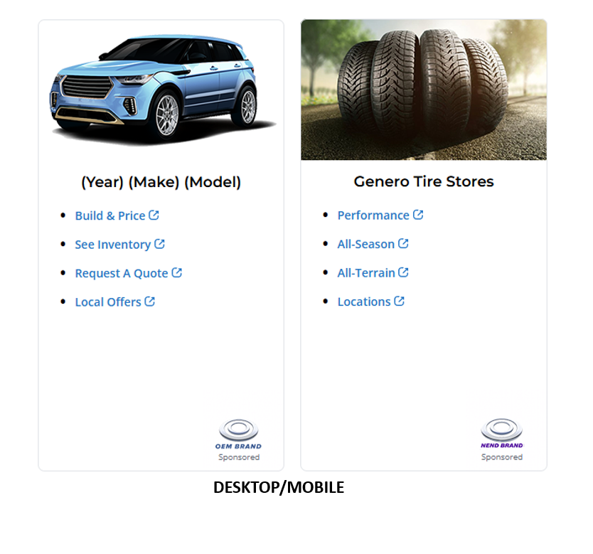 - Multiple click tags: Vehicle image, logo and one for each Call-To-Action (CTA). All redirect to OEM or advertiser site