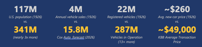 Sources: KBB Average Transaction Price Jan 2026 · Cox Automotive/Moody’s Analytics Vehicle Affordability Index Jan 2026 · Cox Automotive Car Buyer Journey Study 2025 · Cox Automotive Q1 2026 Industry Insights · FHWA Historical Data · Motor Magazine 1922 · BLS Historical Wage Series